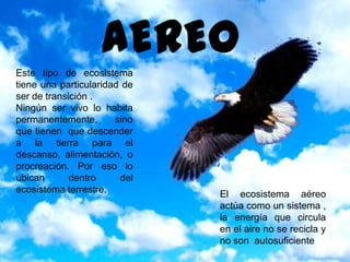Este documento describe los diferentes tipos de ecosistemas, incluyendo ecosistemas aéreos, acuáticos y terrestres. Los ecosistemas aéreos son de transición y ningún ser vivo los habita permanentemente. Los ecosistemas acuáticos son marinos u de agua dulce. Los ecosistemas terrestres son donde los organismos viven y se desarrollan en el suelo y aire circundante. El documento también menciona los componentes, procesos y tipos de ecosistemas.