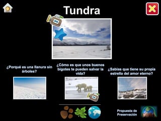 El documento presenta información sobre la tundra, un ecosistema ártico caracterizado por tener bajas temperaturas y estar permanentemente congelado. Describe las plantas y animales que habitan la tundra, incluyendo la estrella de las nieves, el musgo, el liquen, el águila real, el zorro ártico, la liebre ártica y el oso polar. Explica cómo estas especies se han adaptado a las duras condiciones del clima ártico y se relacionan entre sí en la cadena alimenticia de la tundra.