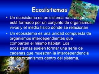 Los ecosistemas pueden ser acuáticos u terrestres. Los acuáticos incluyen ecosistemas de agua dulce y salada, y pueden ser fóticos u afóticos dependiendo de la penetración de la luz. Los ecosistemas terrestres principales son bosques, matorrales, praderas, desiertos y tundra, y varían según factores como la humedad y temperatura.
