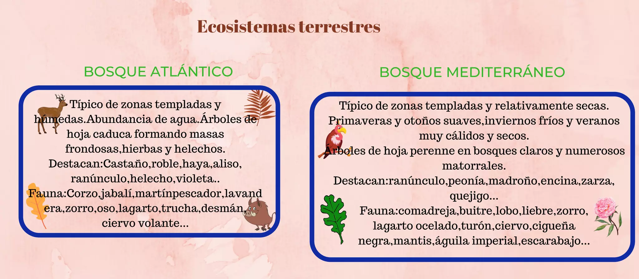 Este documento describe los principales ecosistemas terrestres, incluyendo bosques templados como el bosque atlántico y el bosque mediterráneo, ecosistemas tropicales como la selva y la sabana, ecosistemas áridos como el desierto y la estepa, y ecosistemas fríos como la tundra y la taiga. Para cada ecosistema se mencionan las características climáticas, la vegetación y fauna más comunes.