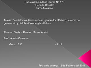 El documento describe varios ecosistemas como desiertos, selvas, bosques, tundras, pantanos y arrecifes de coral. También habla sobre fibras ópticas, generadores eléctricos y sistemas de generación y distribución de energía. El trabajo fue realizado por una estudiante para un profesor y grupo en febrero de 2011.