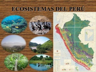 El documento describe diferentes tipos de ecosistemas, incluyendo acuáticos, aéreos y terrestres. Los ecosistemas terrestres se clasifican como tropicales, templados o desérticos dependiendo del clima. Los componentes de un ecosistema incluyen factores abióticos como la luz, temperatura y suelo, así como factores bióticos que son los organismos vivos. Los ecosistemas experimentan cambios dinámicos a lo largo del tiempo a medida que los organismos se adaptan y utilizan recursos a través de