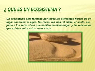 Este documento describe los diferentes tipos de ecosistemas, incluyendo terrestres como bosques, desiertos y montañas, y acuáticos como mares, ríos y lagos. Explica que un ecosistema está formado por elementos físicos como el suelo y el agua, así como por una variedad de seres vivos que interactúan entre sí a través de relaciones como las cadenas alimentarias. Los ecosistemas varían según factores como la ubicación, el clima y la disponibilidad de recursos, lo que determina las espec