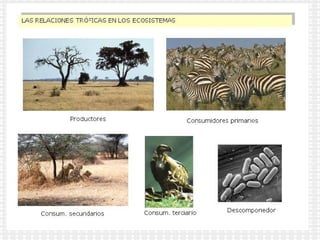 Los ecosistemas son conjuntos de componentes vivos e inertes que interactúan entre sí. Incluyen plantas, animales, factores físicos y químicos. Existen relaciones tróficas entre productores, consumidores y descomponedores. Los ecosistemas pueden ser naturales o humanizados y variar según el clima, como bosques, desiertos, océanos y tundras. Las acciones humanas como deforestación o vertidos son perjudiciales, mientras que la conservación y reforestación son beneficiosas.