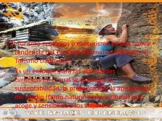 El ecoturismo es una forma de turismo sostenible centrada en la naturaleza que ha experimentado un rápido crecimiento. Se clasifica en tres categorías dependiendo de su enfoque en la conservación de la naturaleza, cultura y beneficios para las comunidades locales. Algunos de los países líderes en ecoturismo son Costa Rica, Ecuador, Kenia y Argentina. El ecoturismo ayuda a conservar el medio ambiente y mejorar el bienestar de las comunidades cuando los viajeros visitan las áreas naturales de manera responsable.