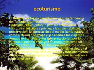Este documento describe varios sitios de ecoturismo en Colombia, incluyendo el Eje Cafetero, el Parque Nacional del Café, los Termales de Santa Rosa de Cabal, el Jardín Botánico del Quindío y el Parque Natural Nacional Serranía de Macuira. Brinda información sobre las características y ubicaciones de cada uno de estos destinos ecoturísticos colombianos.
