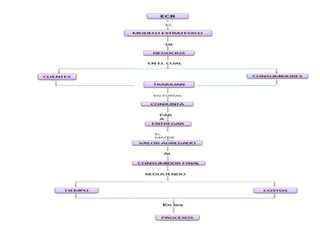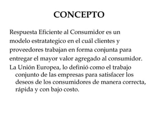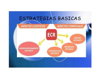 El documento describe el concepto de Respuesta Eficiente al Consumidor (ECR), un modelo estratégico en el que clientes y proveedores trabajan juntos para entregar el mayor valor agregado al consumidor. El ECR surgió de las organizaciones estadounidenses como una forma de acortar el ciclo de abastecimiento. Al usar ECR, las empresas buscan aumentar la eficiencia de la cadena de suministro, integrar procesos logísticos y comerciales, y satisfacer las necesidades reales de los consumidores para maximizar la satisfacción del cliente