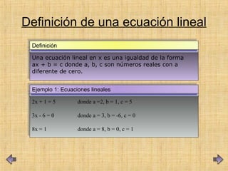 El documento define una ecuación lineal como una igualdad de la forma ax + b = c donde a, b y c son números reales y a es diferente de cero. Presenta ejemplos de ecuaciones lineales y no lineales, y explica que la solución o raíz de una ecuación es el valor que la hace cierta. Además, introduce las reglas básicas para resolver ecuaciones lineales mediante la obtención de ecuaciones equivalentes.