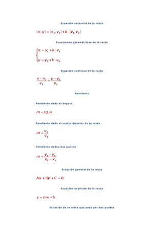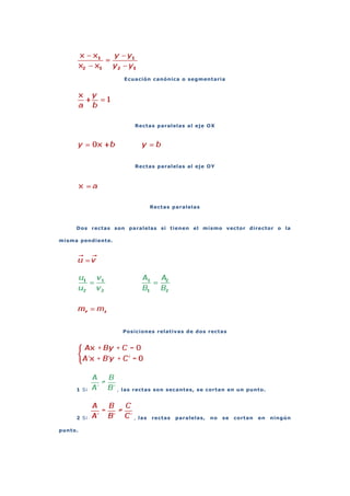 Este documento presenta diferentes formas de representar una recta en el plano cartesiano, incluyendo ecuaciones paramétricas, vector director, pendiente, ecuación general, ecuación explícita, ecuación de una recta que pasa por dos puntos, ecuación canónica, rectas paralelas al eje x y y, rectas paralelas, posiciones relativas de dos rectas, y ejemplos de problemas relacionados con rectas.