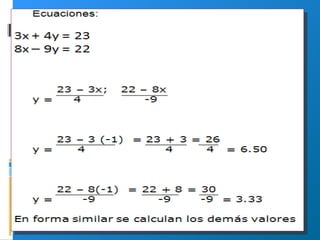 Este documento describe los sistemas de ecuaciones simultáneas y diferentes métodos para resolverlos. Un sistema de ecuaciones simultáneas consiste en dos o más ecuaciones con dos o más incógnitas que se satisfacen para los mismos valores de las incógnitas. Se presentan tres métodos para resolver sistemas de ecuaciones simultáneas: el método de sustitución, el método de combinación lineal, y el método gráfico.