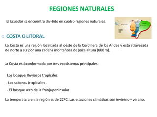 Ecuador se encuentra ubicado en el noroeste de América del Sur, limitando con Colombia, Perú y el Océano Pacífico. El país se divide en cuatro regiones naturales principales: la Costa, la Sierra, la Amazonía y las Islas Galápagos. La geografía ecuatoriana es diversa, con costas, montañas, selvas y ecosistemas únicos.