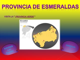 La provincia de Esmeraldas se encuentra ubicada al noroeste de Ecuador, limitando con Colombia. Tiene una población de aproximadamente 430,000 habitantes, de los cuales 210,000 viven en zonas urbanas y 220,000 en zonas rurales. La economía se basa principalmente en la agricultura, la pesca y el comercio. Algunas de sus principales ciudades e atracciones turísticas incluyen Tola, Playa Ancha, Muisne y Tonchapa.