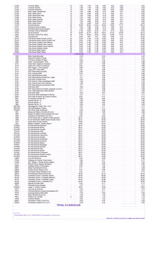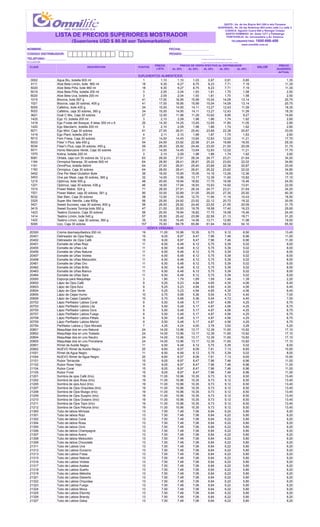 Este documento presenta una lista de precios de productos de belleza y suplementos alimenticios con diferentes porcentajes de descuento aplicables. Incluye el código del producto, la descripción, la cantidad solicitada, los precios con descuentos del 20% al 40% y el precio sugerido. El documento también solicita verificar la puntuación antes de aplicar el descuento e indicar el período de calendario al que se aplica el pedido.