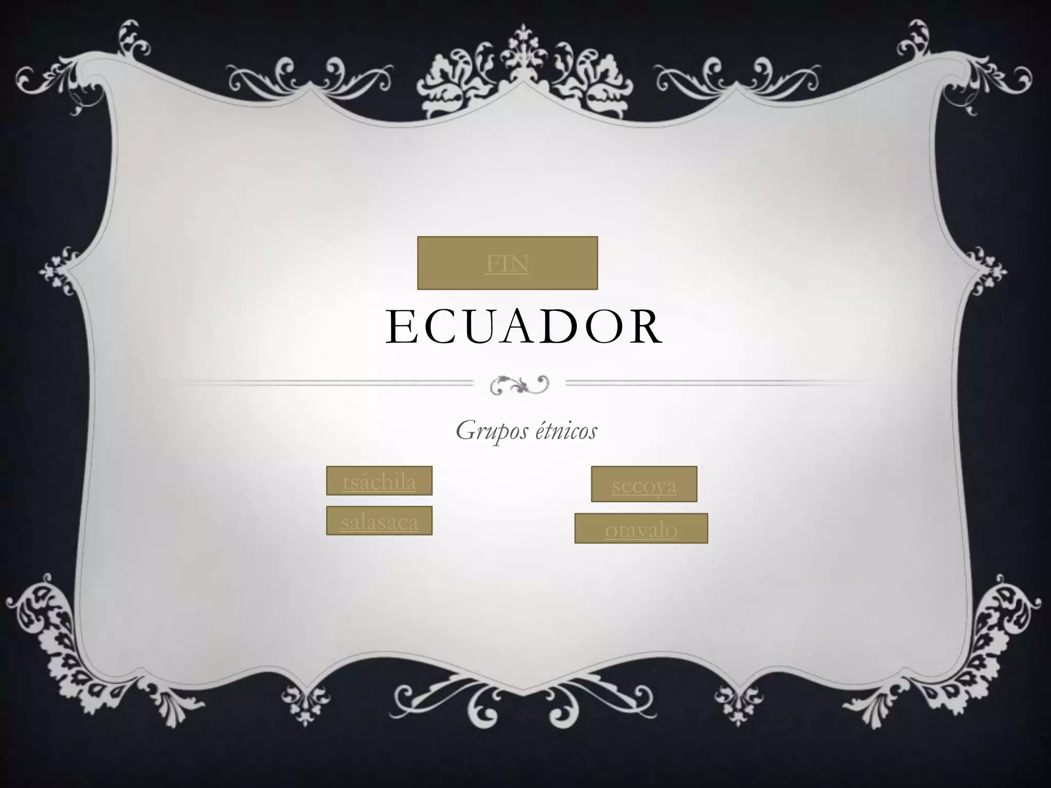 Este documento menciona cuatro grupos étnicos de Ecuador: los tsáchila, secoya, otavalo y salasaca.