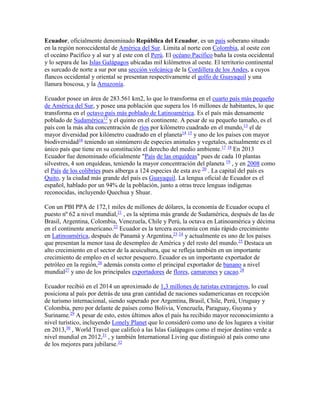 Ecuador es un país soberano ubicado en el noroeste de América del Sur, limita con Colombia y Perú y tiene costa en el océano Pacífico. Posee una superficie de 283.561 km2 y una población de más de 16 millones de habitantes, siendo el país más densamente poblado de Sudamérica. Ecuador tiene una gran diversidad biológica y es el país con mayor concentración de orquídeas y colibríes en el mundo.