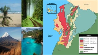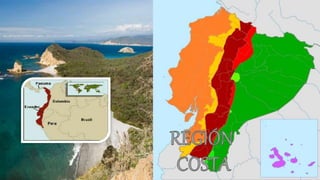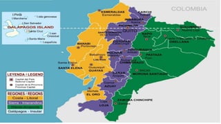 El documento describe las diferentes regiones geográficas de Ecuador, incluyendo la región costera, la región interandina, y la región amazónica. Detalla las provincias que componen cada región y los principales productos agrícolas cultivados. También menciona que Ecuador tiene diversos climas y microclimas debido a su geografía que incluye la costa, los Andes y la Amazonía.