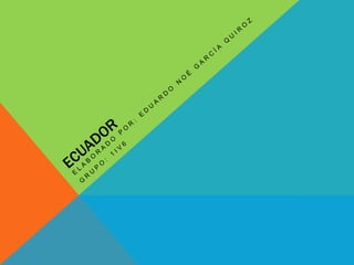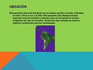 Ecuador está bordeado por el océano Pacífico, Colombia y Perú. Alberga muchas especies raras debido a su ubicación en la línea ecuatorial. La bandera representa la independencia, diversidad y abundancia del país. Ecuador es hogar de especies como tortugas, lobos marinos y orquídeas, y las islas Galápagos son conocidas por su tortuga verde. La economía se basaba originalmente en la agricultura pero ahora depende del petróleo.