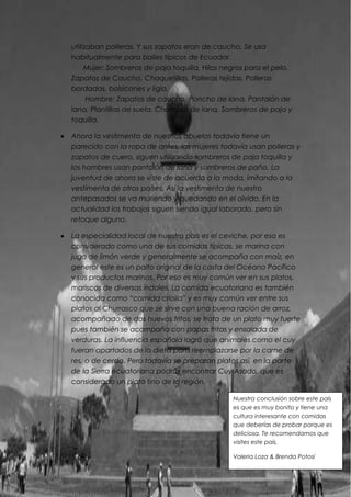 Ecuador es un país situado en el noroeste de América del Sur. Limita con Colombia, Perú y el océano Pacífico. Su capital es Quito, donde se encuentra la mitad del mundo. Ecuador también posee las Islas Galápagos, un archipiélago volcánico conocido por su flora y fauna únicas. La vestimenta tradicional ecuatoriana incluía sombreros de paja y lana tejida, aunque ahora se adopta más la moda internacional. Las comidas típicas son el ceviche y el churras