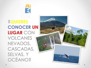 El documento promueve al Ecuador como un destino turístico ideal en 2015, destacando sus volcanes nevados, cascadas, selvas, océano, ruinas incas, iglesias barrocas, catedrales góticas, diversidad de especies de aves, anfibios, reptiles e insectos, 23 lenguas ancestrales, diversidad de razas, y gente amable y cálida.
