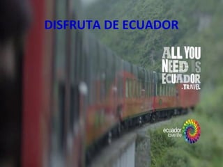 Ecuador ofrece diversas atracciones turísticas como playas, cultura, ecoturismo y aventura. La campaña "Todo lo que necesitas es Ecuador" busca posicionar al país como destino de clase mundial. Ecuador se divide administrativamente en 24 provincias con diferentes regiones geográficas como la sierra, costa, amazonía y Galápagos. Ofrece servicios como alojamiento, restaurantes, agencias de viaje y transporte. Las actividades varían según la región pero incluyen circuitos, comunidades locales, naturaleza y deportes.