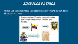 Los tres principales símbolos patrios del Ecuador son la bandera, el escudo y el himno nacional. La bandera tiene tres colores - amarillo, azul y rojo - que representan la riqueza nacional, el mar y cielo ecuatorianos, y la sangre derramada por los héroes. El escudo contiene elementos como el cóndor, el sol, el nevado Chimborazo, signos zodiacales, un buque, y ramas de olivo y laurel. El himno nacional fue escrito por Juan León Mera y compuesto