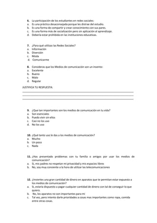 Este documento presenta una encuesta de 15 preguntas dirigida a estudiantes de grado 10 sobre su uso y percepción de los medios de comunicación. La encuesta explora cómo influyen los medios en el desarrollo personal y social de los jóvenes, sus hábitos de ver televisión y usar redes sociales, y si creen que los medios pueden afectar valores o aislarlos de su familia.