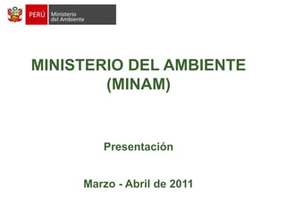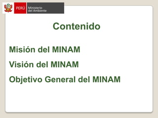 El documento presenta la misión, visión y objetivo general del Ministerio del Ambiente de Perú (MINAM), los cuales se enfocan en conservar el ambiente, dirigir la gestión ambiental nacional de forma técnica y científica, y contribuir al desarrollo sostenible de las generaciones presentes y futuras. También describe la información disponible en la biblioteca virtual y el metabuscador del Centro de Documentación Ambiental del MINAM sobre temas ambientales.