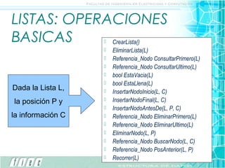 Este documento describe diferentes tipos de listas enlazadas como listas simples, doblemente enlazadas y circulares. Explica las operaciones básicas como crear, insertar, eliminar y buscar nodos. También detalla la implementación de listas doblemente enlazadas y circulares, incluyendo cómo crear y recorrer nodos en estas estructuras de datos.