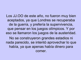 Los Juegos Olímpicos de Londres 1948 se celebraron en medio de la austeridad de la posguerra, ya que la ciudad se estaba recuperando de la Segunda Guerra Mundial. No se construyeron nuevas instalaciones y los atletas tuvieron dificultades para entrenar debido a la falta de recursos. A pesar de las circunstancias, la competición contó con grandes momentos como las cuatro medallas de oro ganadas por la atleta Fanny Blankers-Koen y la victoria de Delfo Cabrera en el maratón