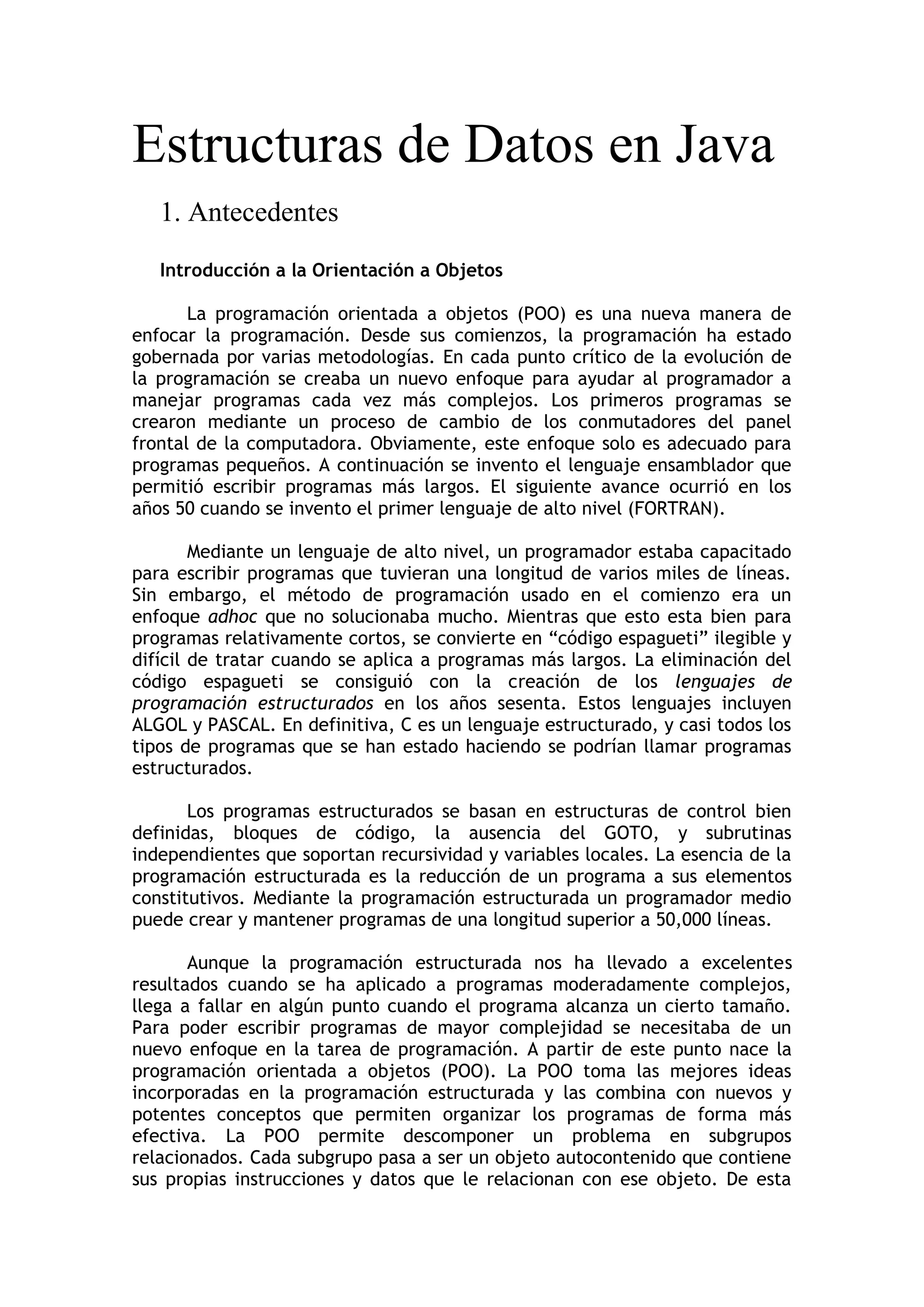 El documento introduce los conceptos básicos de la programación orientada a objetos y las estructuras de datos en Java. Explica que la POO permite descomponer un problema en objetos autocontenidos que encapsulan datos y código. También describe tres características clave de la POO: encapsulación, polimorfismo y herencia. Luego, define los tipos de datos abstractos y diferentes estructuras de datos como arreglos, listas y árboles, con un enfoque en los arreglos lineales en Java.