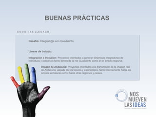 El documento presenta iniciativas de integración y inclusión en la red Guadalinfo, enfocadas en la creación de dinámicas que integren a inmigrantes en Andalucía. A través de un sitio web, se busca que los inmigrantes compartan sus historias y culturas, fomentando un entendimiento mutuo. Se destaca la colaboración de más de 15 centros Guadalinfo y la participación de usuarios de 22 países.
