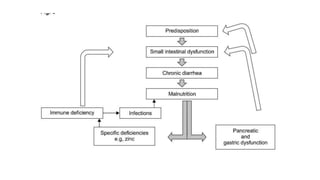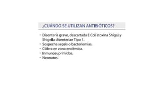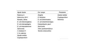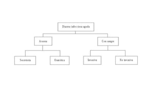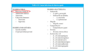 La diarrea aguda es una de las enfermedades más comunes en niños y la segunda causa de morbilidad y mortalidad a escala mundial. Se define como más de 3 deposiciones de menor consistencia en 24 horas, asociadas o no a síntomas generales. Puede ser causada por factores osmóticos, secretores o inflamatorios que alteran la absorción o secreción intestinal, resultando en una pérdida de volumen de agua y electrolitos que excede la capacidad de absorción del colon. Esto puede llevar a deshidratación si no