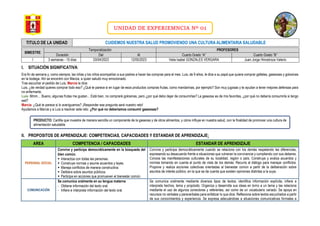 El documento detalla una unidad educativa sobre la promoción de una cultura alimentaria saludable para estudiantes de cuarto grado, enfocándose en la importancia de seleccionar alimentos nutritivos en lugar de golosinas y gaseosas. Incluye objetivos de aprendizaje en diversas áreas como personal social, comunicación, matemáticas, arte y ciencia, proponiendo actividades que desafían a los alumnos a investigar y reflexionar sobre los hábitos alimentarios y su impacto en la salud. Se busca desarrollar competencias clave en los estudiantes que fomenten su autonomía y les permitan contribuir a su bienestar y al de su comunidad.