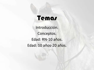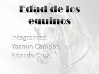 Este documento describe cómo determinar la edad aproximada de un caballo mediante el examen de su dentadura. Explica que hasta los 11 años, la forma de las mesas dentarias y el grado de desgaste de los dientes pueden indicar si un caballo tiene entre 1 y 11 años. Después de los 11 años, es más difícil precisar la edad, aunque se pueden observar características como la forma triangular de los dientes hasta los 20 años.