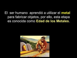 El documento describe las diferentes edades de los metales en la historia humana, comenzando con la Edad de Cobre desde el 4000 a.C. hasta el 3000 a.C., seguida por la Edad de Bronce desde el 3000 a.C. hasta el 1500 a.C., y finalmente la Edad de Hierro desde el 1500 a.C. en adelante. Cada nueva edad trajo el uso de un metal más avanzado y resistente que permitió a esos pueblos dominar a los que aún usaban metales anteriores.