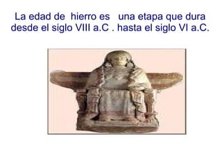La edad de hierro se desarrolló entre los siglos VIII y VI a.C., cuando se descubrió el uso del hierro de forma simultánea en muchas zonas del mundo. Durante este período, las personas calentaban el hierro y le daban forma para hacer joyas y construir palacios, vestían ropas largas con mangas anchas, y pescaban con redes.
