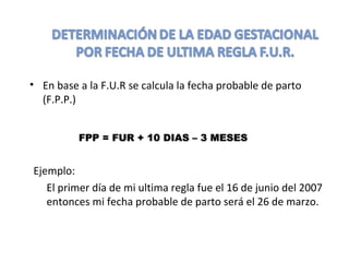 1) Explica cómo calcular la fecha probable de parto (FPP) basándose en la fecha de la última regla (FUR) y proporciona dos métodos (Regla de Nagele y adición de 10 días a la FUR menos 3 meses).