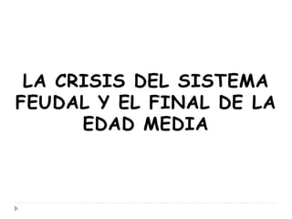 El documento describe la transición entre la Antigüedad Tardía y la Edad Media en Europa. Se produjo una crisis del Imperio Romano que llevó a la ruralización de la economía y la sociedad, fragmentando el poder político. Esto dio lugar al sistema feudal caracterizado por una estratificación social rígida, el predominio de la agricultura y la decentralización política a través de relaciones de vasallaje.