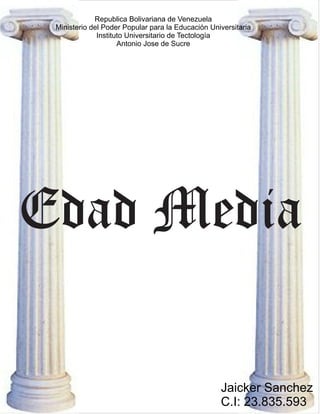 El documento describe varios aspectos clave de la Edad Media como el período histórico comprendido entre los siglos V y XV en Europa Occidental, con un inicio marcado por la caída del Imperio Romano de Occidente y un fin asociado con el descubrimiento de América. Se divide este período en la Alta y Baja Edad Media, y se mencionan algunos hitos culturales como las ciudades amuralladas y los castillos medievales. También se hace referencia a la transición entre la Antigüedad Tardía y la