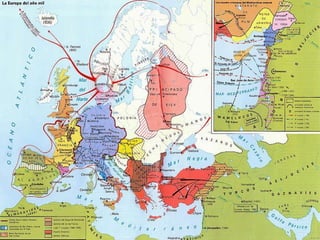 El documento resume la Alta Edad Media y el feudalismo. Describe las invasiones bárbaras que condujeron a la formación de reinos germánicos en Europa occidental entre los siglos V y VII, incluidos los visigodos, francos y lombardos. También explica el surgimiento y consolidación del poder de la dinastía carolingia bajo Pipino el Breve y Carlomagno.