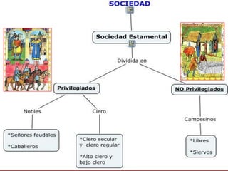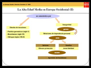 Este documento resume los principales aspectos de la Alta Edad Media en Europa, desde el siglo V hasta el siglo XI. Resalta los intentos por renacer el antiguo Imperio Romano a través de los reinos bárbaros, el Imperio Carolingio y el Sacro Imperio Romano Germánico. También describe el imperio bizantino como continuador de la cultura clásica. Finalmente, explica el surgimiento del feudalismo como sistema social, político y económico característico de este periodo.