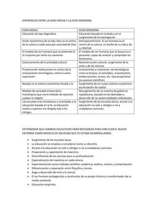 El documento resume las principales diferencias entre la educación en la Edad Media y la Edad Moderna. Durante la Edad Media, la educación era dogmática y teocéntrica, con Dios como centro. En la Edad Moderna, la educación se basó en la duda y la investigación, y el ser humano pasó a ser el centro. Esto requirió cambios educativos como la aparición de escuelas laicas y el acceso a la educación para ciudadanos comunes, no solo clérigos.