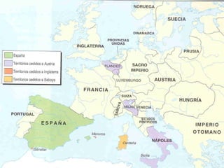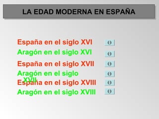 La Edad Moderna abarca desde 1492 hasta 1789, comenzando con el descubrimiento de América y finalizando con la Revolución Francesa. El documento describe la historia de España y Aragón durante este período, destacando que en el siglo XVI España conquistó gran parte de América y se convirtió en una potencia, mientras que Aragón experimentó un gran desarrollo económico. En los siglos XVII y XVIII, tanto España como Aragón sufrieron crisis y decadencia, aunque también hubo períodos de recuper