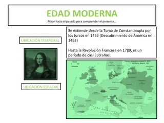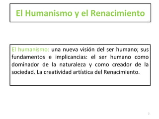 El documento describe el humanismo y el Renacimiento durante la Edad Moderna. El humanismo fue un movimiento intelectual que se centró en el estudio de la cultura clásica griega y romana y en la revalorización de la dignidad humana. Surge en Italia en los siglos XIII-XVI y se difundió a otros países europeos. Los principales representantes del humanismo fueron figuras como Petrarca, Boccaccio, Erasmo y Tomás Moro. El Renacimiento plasmó los valores humanísticos en el arte, destacando artistas como Bottic