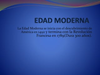 La Edad Moderna se inició con el descubrimiento de América en 1492 y terminó con la Revolución Francesa en 1789. Durante este período, el comercio y la burguesía ganaron poder, mientras que los nuevos productos de América causaron grandes cambios en la alimentación y el crecimiento de las ciudades. También hubo importantes avances científicos y culturales, así como una expansión de las artes patrocinadas por las clases altas.