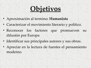 El documento describe el movimiento humanista en Europa durante los siglos XIII-XVI. Se caracteriza por poner al ser humano en el centro y valorar la razón y el conocimiento clásico. Menciona a autores italianos como Petrarca, Boccaccio y Dante y sus obras influyentes. También señala a pensadores políticos como Maquiavelo, Moro y Erasmo y cómo abordaron temas de gobierno a través de obras como El Príncipe, Utopía y Elogio de la locura. La invención de la imprent