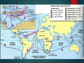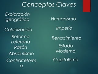 El documento resume la Edad Moderna, periodo entre los siglos XV y XVIII. Aborda conceptos como el humanismo, la exploración geográfica, la colonización y la Reforma Protestante. Explica el surgimiento del estado moderno y las monarquías absolutas en países como España, Francia e Inglaterra. También describe los viajes de descubrimiento que llevaron a Europa a expandirse geográficamente y a establecerse como potencias mundiales. Finalmente, resume eventos como la Contrarreforma católica y el Concilio