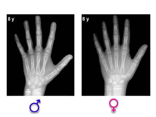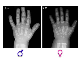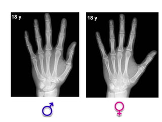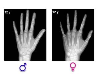 Este documento describe los métodos para estimar la edad ósea, incluyendo la maduración del esqueleto, la edad de la menarquia, la edad dental y los caracteres sexuales. Se enfoca principalmente en la edad ósea, la cual es de gran importancia para evaluar alteraciones del crecimiento y pronosticar la talla final. Explica los métodos planimétricos y numéricos para determinar la edad ósea, y los grupos de edad y huesos que se deben valorar en cada etapa de desarrollo, desde la infancia hasta la