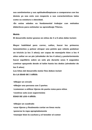 El documento resume las características físicas, psicológicas y motrices típicas de diferentes etapas de desarrollo humano, desde las edades 3-6 años hasta la adultez mayor. Incluye información sobre el crecimiento, lenguaje, frecuencia cardíaca, habilidades motrices y cambios psicológicos asociados a cada etapa.