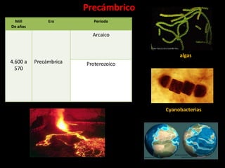 El documento describe la evolución de la Tierra a lo largo del tiempo, desde la formación del sistema solar hasta la aparición del ser humano moderno. Detalla las principales eras geológicas como el Precámbrico, Paleozoico y Mesozoico, y los organismos característicos de cada una como algas, trilobites y dinosaurios. También resume la historia de la Tierra en un año para ilustrar las largas escalas de tiempo involucradas en los cambios geológicos y biológicos.